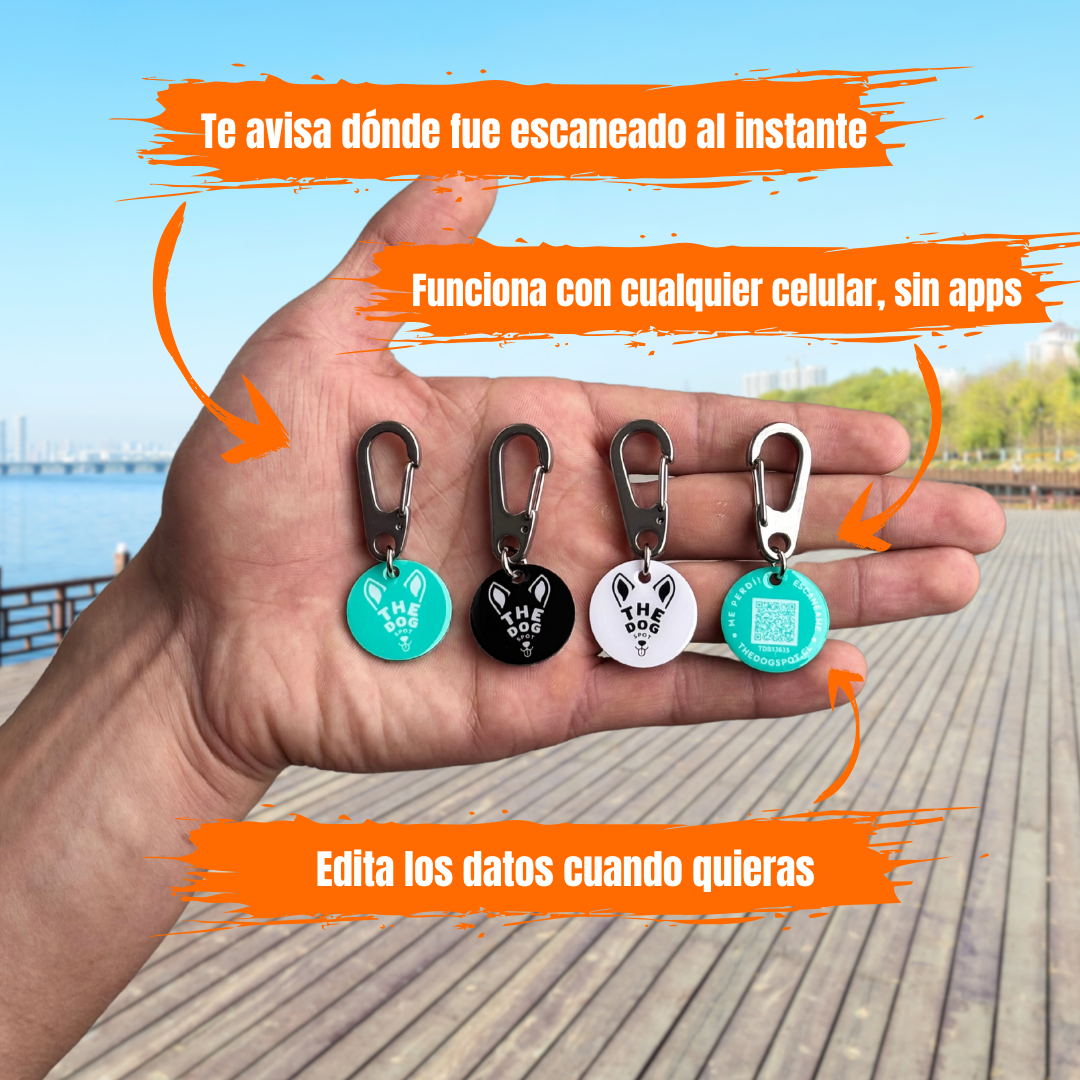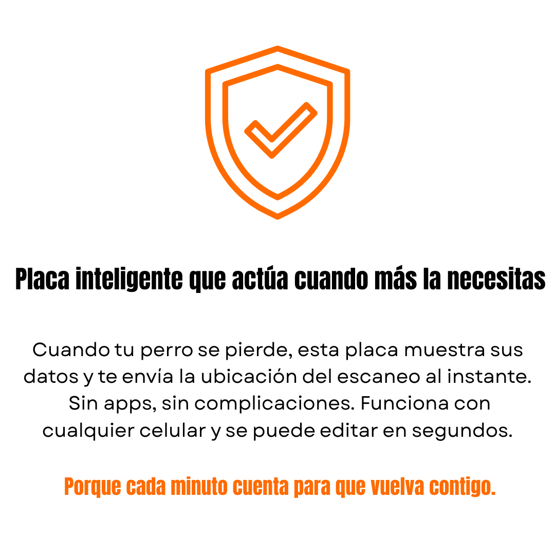 Esta placa muestra los datos clave de tu perro y la ubicación del escaneo mediante GPS pasivo. Sin necesidad de apps, editable en segundos y diseñada para actuar con precisión cuando más importa.